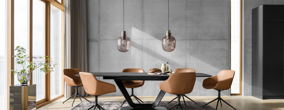 Alicante es una pieza icono entre los diseños de comedor de BoConcept con su llamativa y escultural base y Hauge, una nueva inmersión con delicadas líneas en madera que estrenamos en nuestra nueva colección 2023.