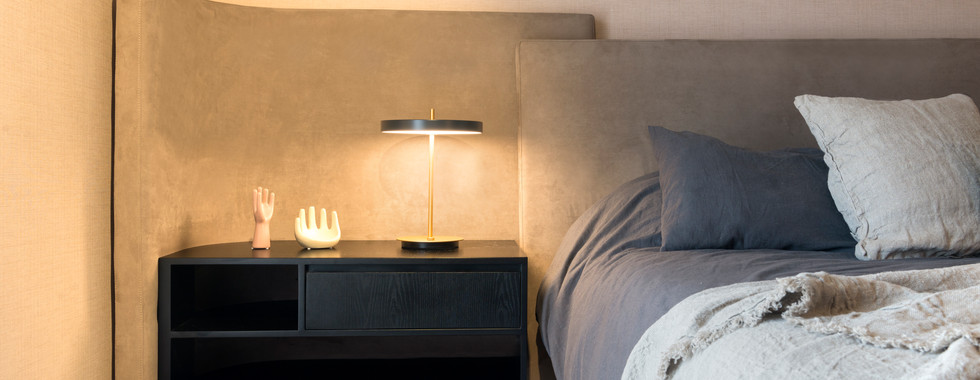 En la pieza principal sí que nos jugamos una carta bien especial, hicimos un respaldo de muro a muro, pero con curvas en los costados, tapizado en eco-gamuza color greige, un diseño único que no habíamos visto en Chile, en él suspendimos dos veladores negros en chapa de Fresno negra ¡Quedó de alto impacto!